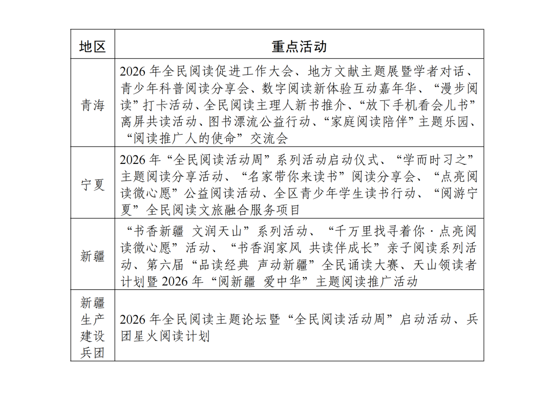1.举办第五届全民阅读大会。深入学习贯彻习近平总书记致首届全民阅读大会贺信精神,以第五届全民阅读大会开幕启动2026年“全民阅读活动周”。精心策划大会各项活动,展示各地区各部门全民阅读工作成果成效,交流全民阅读工作经验做法;发挥文化名家、社会名人的示范作用,吸引群众踊跃参与,激发全民阅读热情。